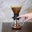 Unlike traditional V60 drippers with which coffee is extracted through the constant pouring of hot water, this dripper is specifically made for immersion extraction. The metal ball placed at the base of the dripper blocks water from flowing through, allowing the poured water to stay inside the dripper. Then, with the push of a button, the coffee flows down into the coffee cup, allowing for easy, even coffee extraction.